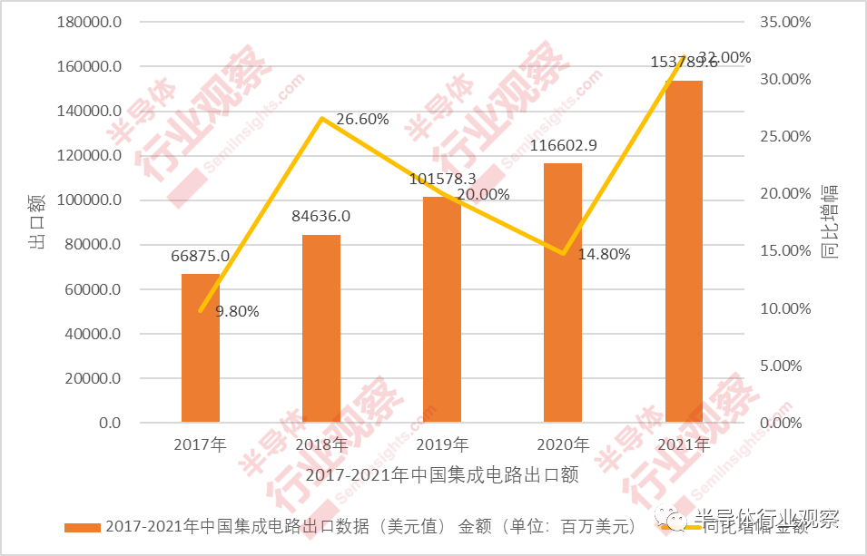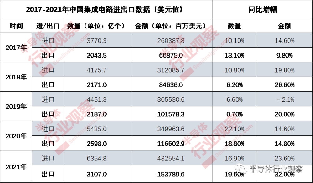2017-2021年中国集成电路进出口数据(半导体行业观察整理)