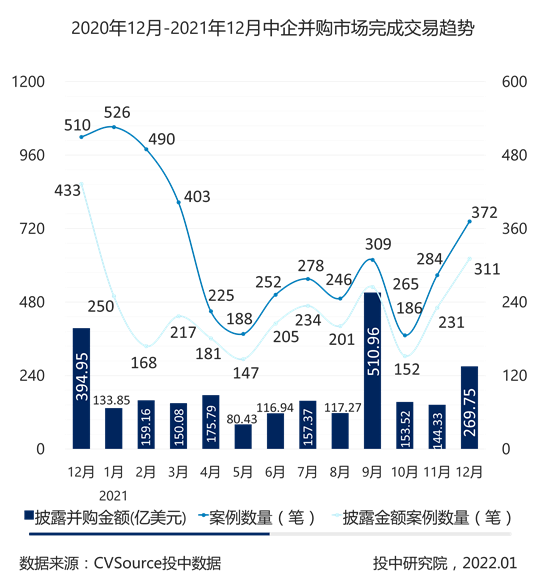 2021年12月共计完成372笔并购交易,环比上升30.99% ,同比下降27.06%;当中披露金额的有311笔,交易总金额为269.75亿美元,环比上升86.90%,同比下降31.70%。
