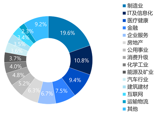 根据CVSource投中数据显示,2021年制造业交易数量最多,共774起,占比19.6%,其次分别为IT及信息化、医疗健康、金融以及企业服务等。