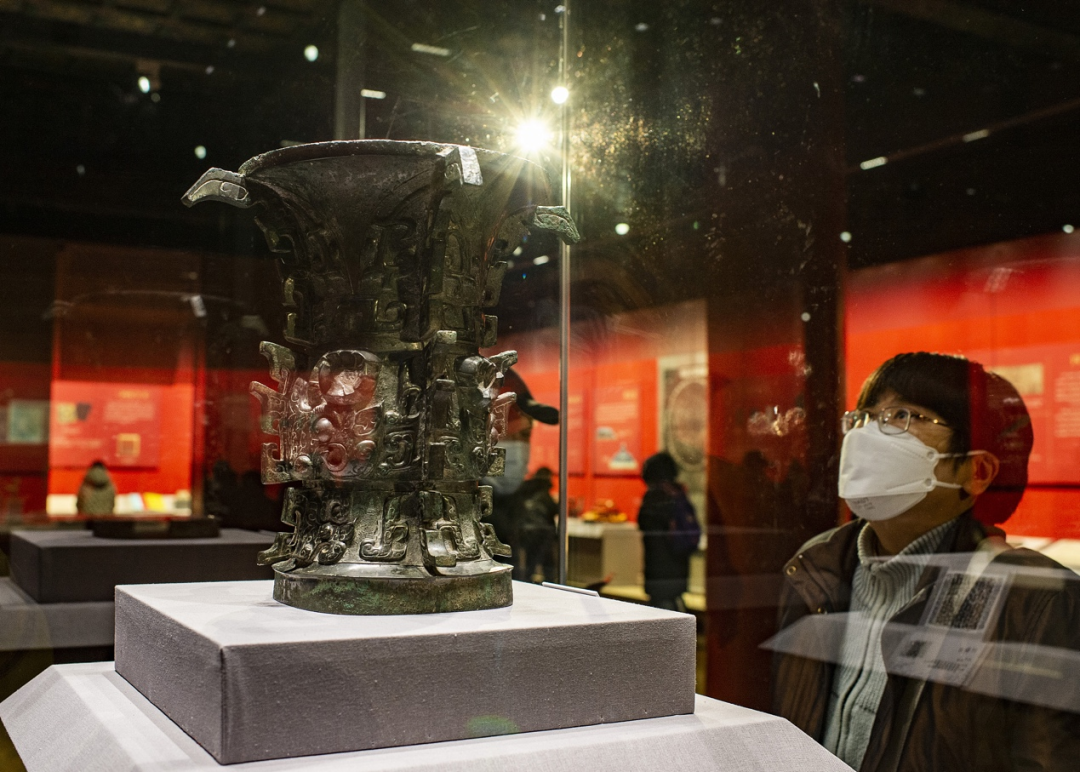2022年1月26日,“何以中国”展在北京故宫博物院举行,观众欣赏宝鸡青铜器博物院藏西周文物“何尊”。图|中新社