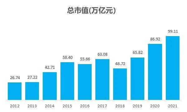 总市值从2012年27万亿上升至2021年末的99万亿元。