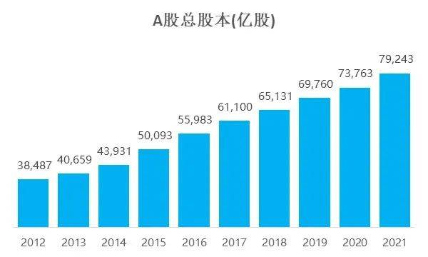 A股总股本7.9万亿股,相比2012年的3.85万亿股,大幅增长105%,反映股票供应的增长。