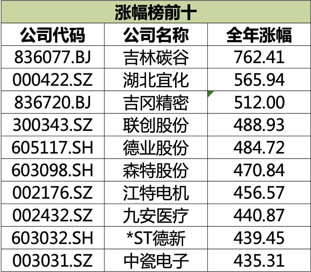 2021年涨幅榜前十,北交所吉林碳谷以762%的涨幅位居榜首。