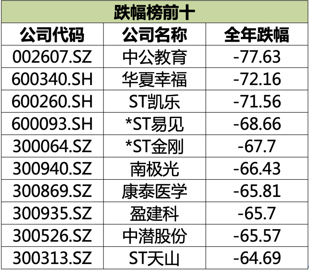 2021年跌幅榜前十,中公教育以78%的跌幅位居跌幅榜之首。