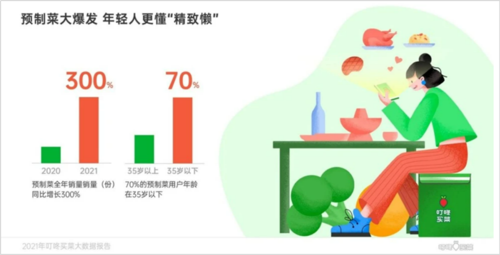 2021年,生鲜电商平台叮咚买菜上预制菜全线产品销量(单位:份)同比去年增长300%,包含预制菜的订单在整体订单的渗透率已经超过40%。