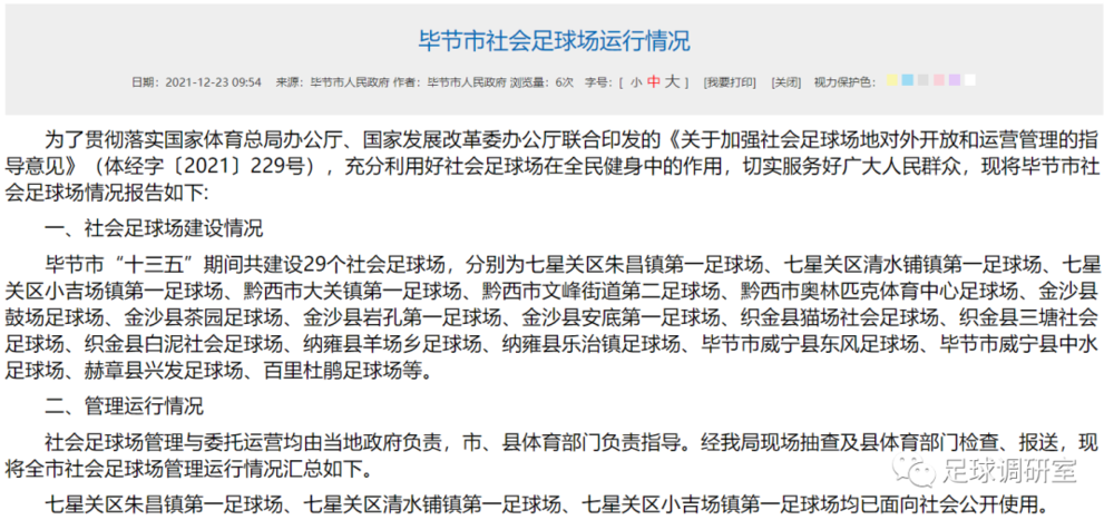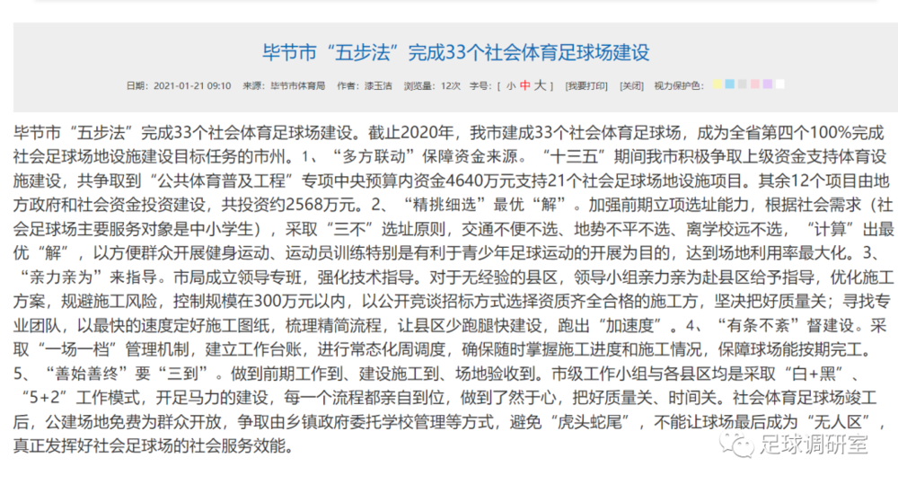 同时,根据毕节市体育局2021年发布的文章《毕节市“五步法”完成33个社会体育足球场建设》中指出: