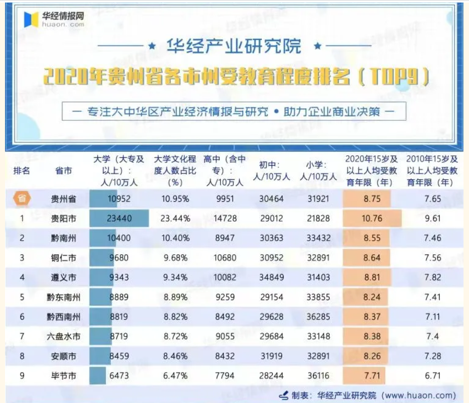 根据华经研究院的一份调研报告中指出,2020年毕节市在贵州省各市州的受教育程度中排名倒数第一。