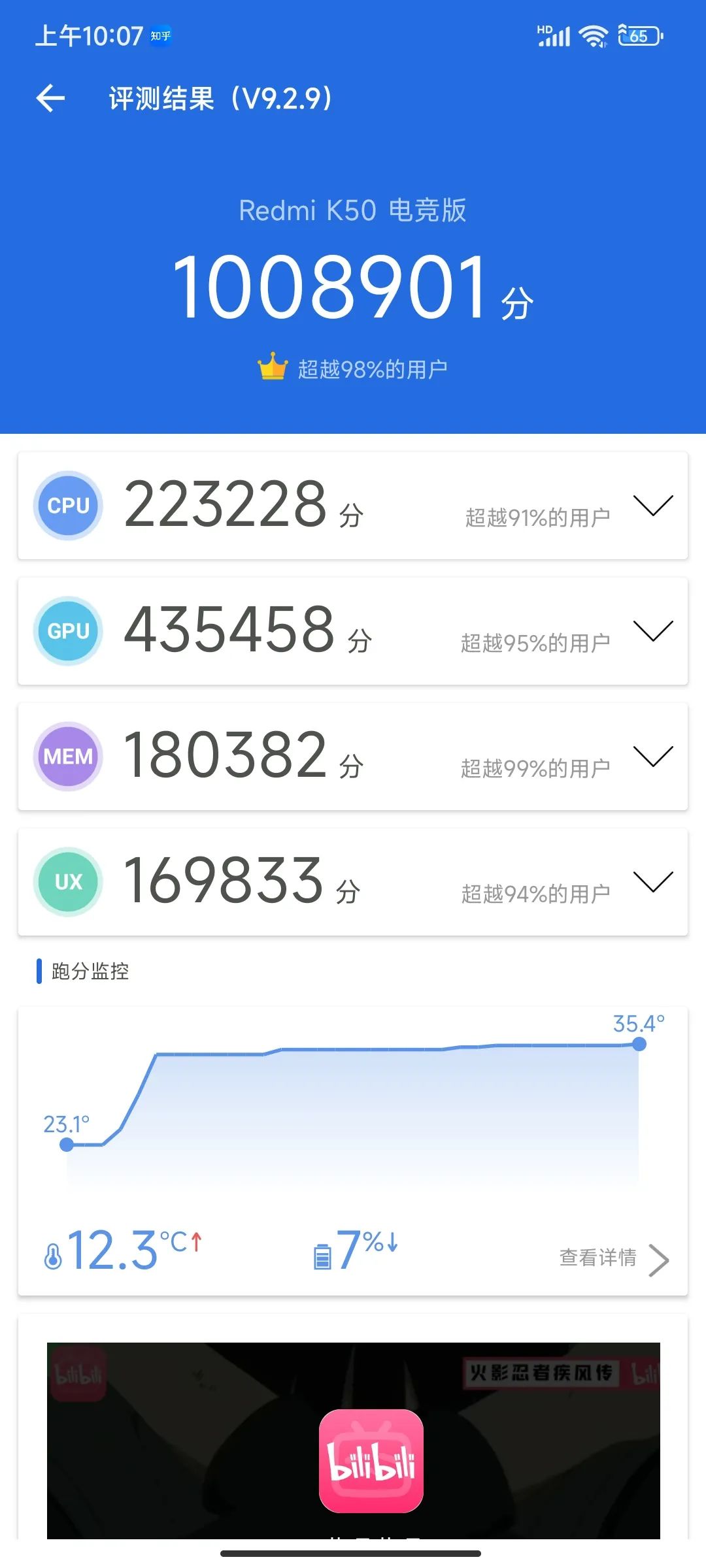 从温度上就能明显感受到这次 K50G 在散热材料使用上的豪华,双 VC 液冷、大面积石墨烯、导热铜块代替凝胶,手机被动散热的配置几乎是能上的都上了,最后果然是将这枚火龙压了下来。