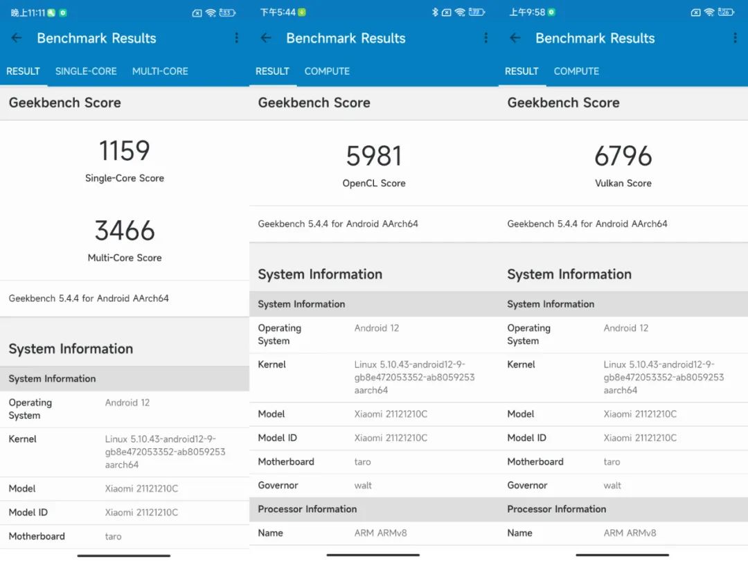 Geekbench5 的单核得分为 1159 分,多核得分为 3466 分。OpenCL 的分数为 5981,Vulkan 分数为 6796。