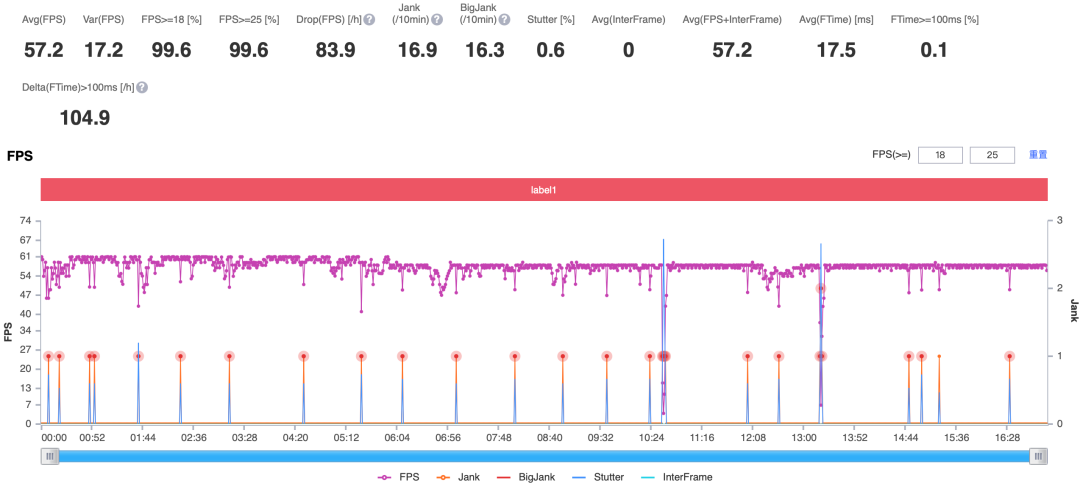 在进行 15min 的游戏过程中,打斗场面帧率波动会较为明显,但是肉眼观感没有明显的掉帧卡顿现象。帧率曲线中断崖式掉帧为角色死亡和传送切换场景。