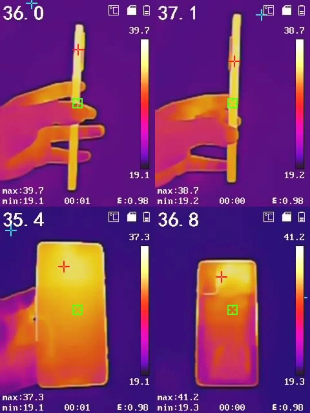 并且在 15min 原神游戏之后,手机的机身温度并没有很烫,实测背面最高温度 41.2°C,正面最高温度 只有 37.3°C,中框温度最高也只有 39.7°C,对于骁龙 8 来说,这样的温度已经算是特别“冷酷”了。
