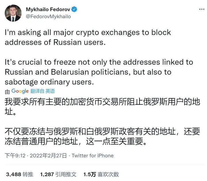也许担心俄罗斯会借助加密货币绕开金融制裁,乌克兰副总理兼数字化部长 Mykhailo 在 Twitter 上发推,呼吁各大主流加密货币交易平台封锁俄罗斯用户的账号。