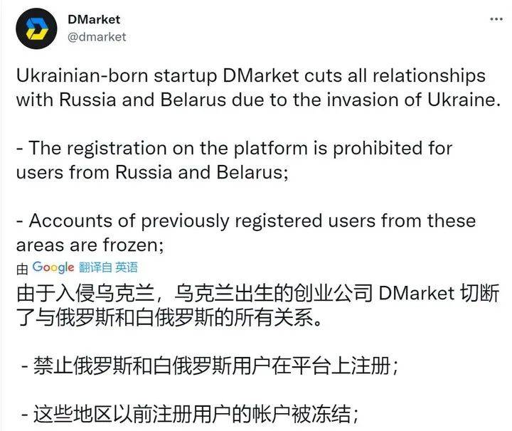 在 Mykhailo 的求救请求发出不久,Dmarket 很快就在 Twitter 上发布公告,称将会冻结来自俄罗斯和白俄罗斯用户的数字资产,暂停这些地区的新用户注册,并将俄罗斯卢布从平台上移除。
