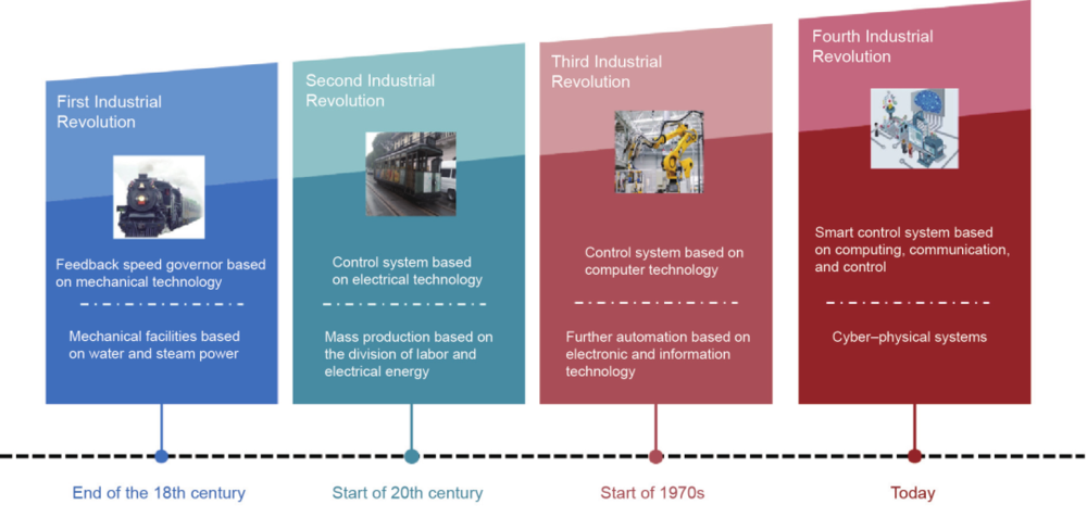 以机械技术为基础的蒸汽机和反馈调速器的出现引发了第一次工业革命;电力和基于电气技术的控制系统的出现引发了第二次工业革命;可编程逻辑控制器(programmable logic controller, PLC)和集散控制系统(distributed control system, DCS)的出现引发了第三次工业革命。从这三次产业革命中可以看出,发展高效的新能源和信息技术是改变工业生产方式和提高工业竞争力的关键。当蒸汽和电力成为能源时,蒸汽机和发电设备就必须使用控制系统。反馈控制技术使机械调速器可以控制蒸汽动力机械缝纫机的速度,而反馈控制技术和逻辑控制技术使电气控制系统可以控制电动屠宰场输送带的稳定运行。通过计算机技术和控制技术的紧密结合而发明的PLC 和DCS 技术,极大提高了大规模生产线的自动化程度。