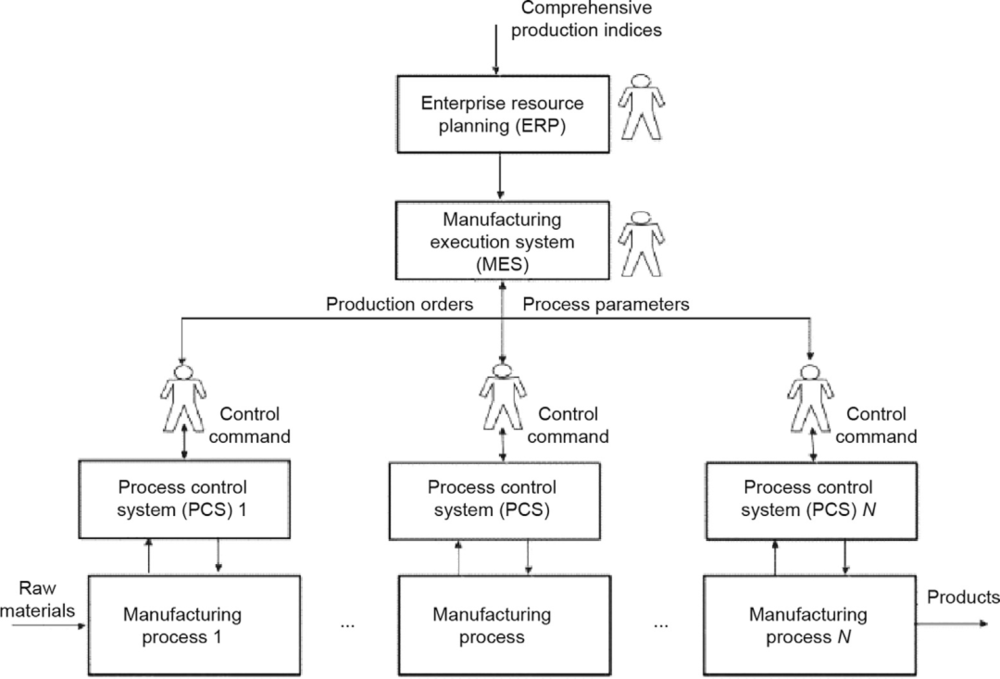 流程工业生产全流程的决策、控制和运行管理现状如图2所示。流程企业普遍采用由企业资源规划(enterprise resource planning, ERP)、制造执行系统(manufacturing execution system, MES)和过程控制系统(process control system, PCS) 组成的三层结构。