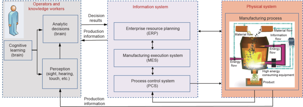 企业经理利用ERP系统得到生产过程各设备的参数,然后根据自身积累的经验和知识,对产品综合生产指标(产品质量、能耗和成本等) 的目标值范围做出决定。生产部门经理利用MES得到生产信息,然后通过自己积累的专家经验来决定生产制造全流程的生产指标目标值范围。运行管理者和工艺工程师通过PCS获得运行条件,通过感官(即视觉、听觉和触觉)获得具体信息,再根据自己积累的经验和知识做出决定,以反映实际生产过程中产品质量、能耗和成本等运行指标的目标值范围,然后操作人员根据自己的经验和知识决定PCS的控制命令。PCS通过控制整个制造和生产过程,使受控过程的输出跟踪控制指令,以提高产品的运行指标并且保证整条生产线的生产指标在期望的目标值范围内。