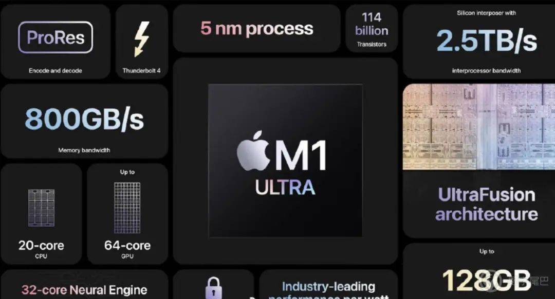 M1 Ultra=M1 Max+M1 Max,M1 Ultra 采用了一种 UltraFusion 的技术,将两颗 M1 Max 封装结合在一起(简单说),内置 20 核 CPU 64 核 GPU 20 核神经引擎,GPU 性能是 M1 的 8 倍。