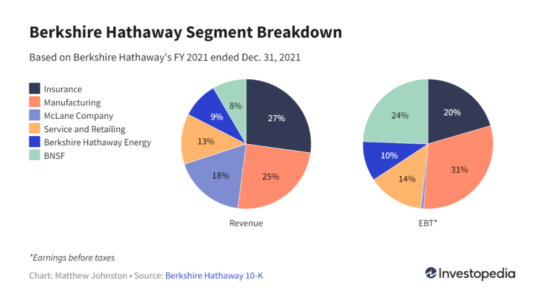 保险是伯克希尔哈撒韦的主要业务之一。2021财年,其保险业务收入增长8.3%至751亿美元,而EBT下降3.0%至66亿美元。保险业务收入占总收入的27%左右,是贡献收入最多的一个部门。