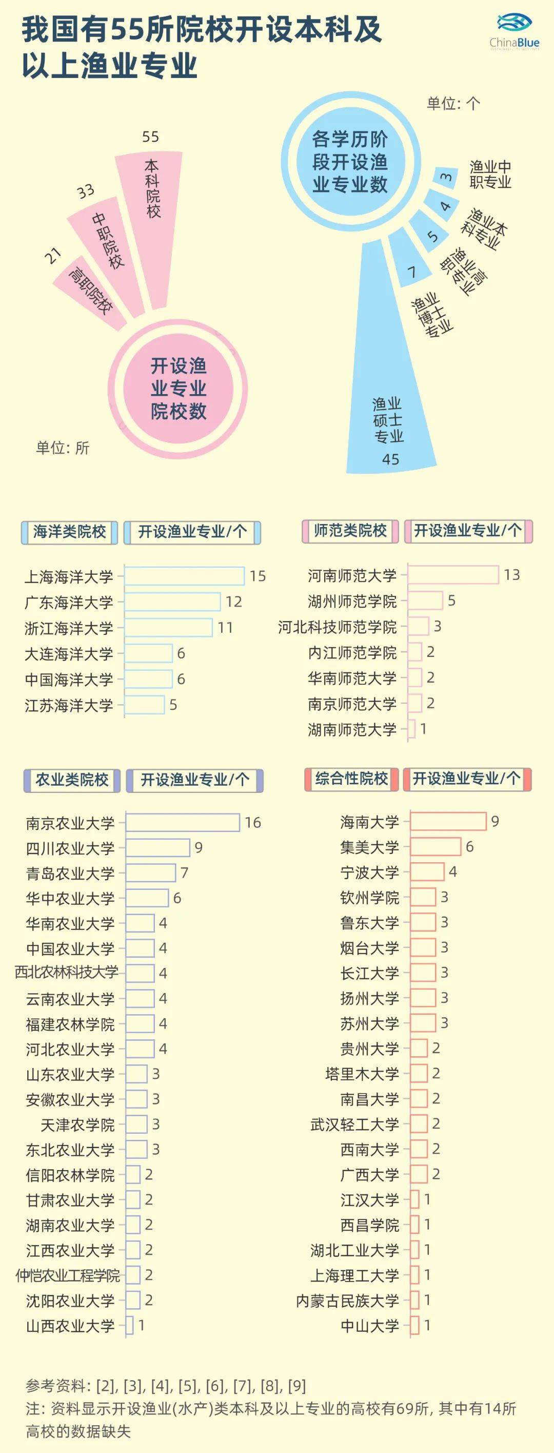 [12] 注:我国各院校开设的渔业(水产)类本科专业有4个:水族科学与技术、水生动物医学、水产养殖学、海洋渔业科学与技术