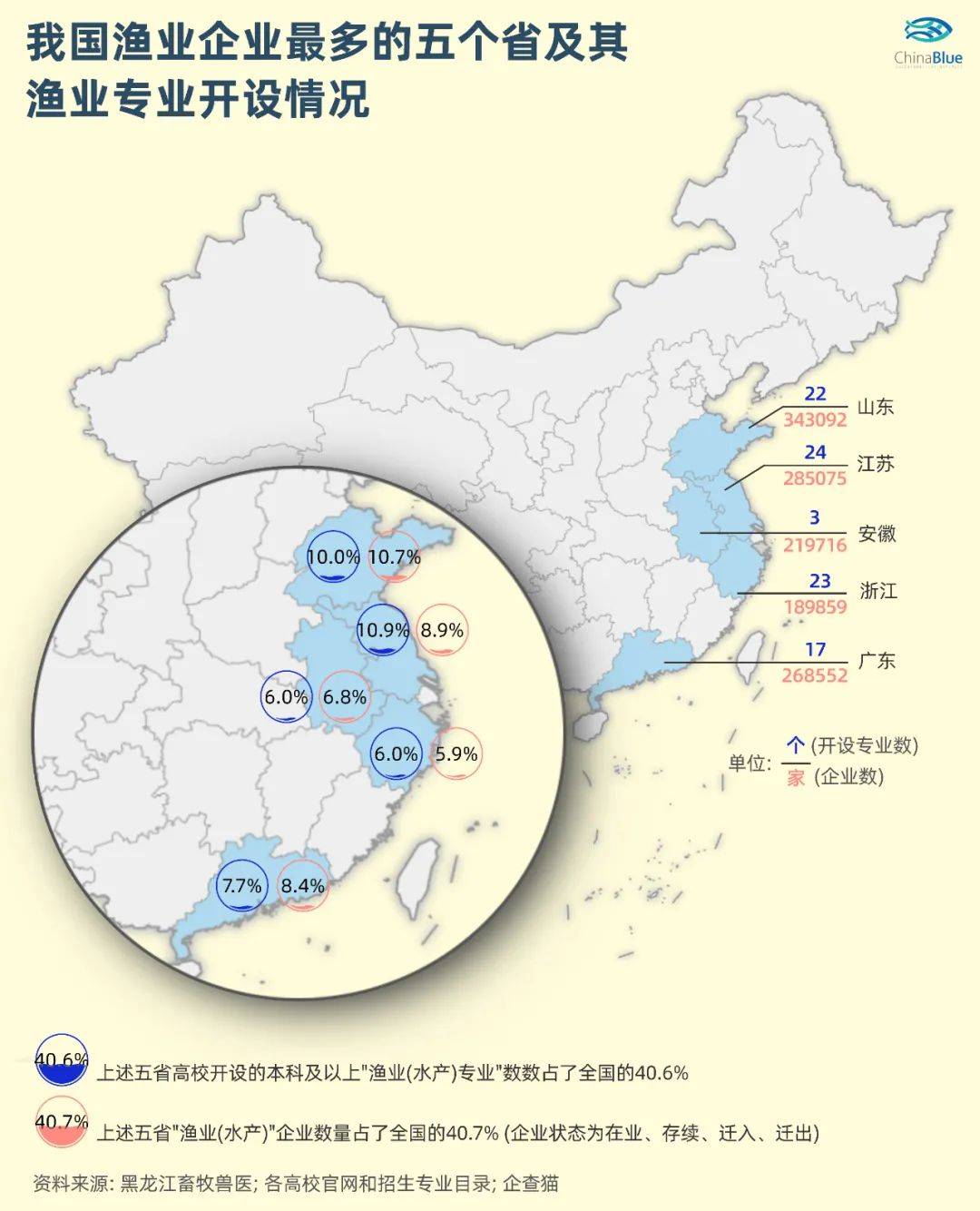 而从渔业(水产)人才和相关企业的集中度来看,仅山东、江苏、安徽、浙江、广东五省,其高校开设的本科及以上渔业(水产)专业数和渔业(水产)企业数量均占到了全国的40.6%以上,妥妥渔业 (水产)大省的范儿。