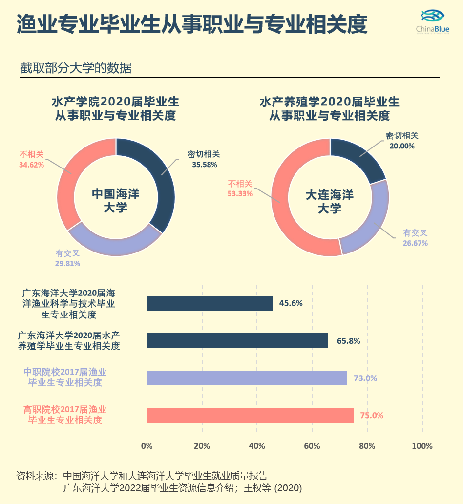 那么渔业(水产)类专业毕业生从事的职业与专业是否相关呢?由于统计口径不一样,不同学校的数据略显不同。但根据中国海洋大学和大连海洋大学对2020届对渔业(水产)毕业生的调查数据(部分高校数据有缺失),总的来说,相比于电子信息工程和财经等热门专业,渔业(水产)专业毕业生的专业对口率比较低。这在人才极度稀缺、企业抢着要人的渔业(水产)行业,似乎有点出乎寻常?