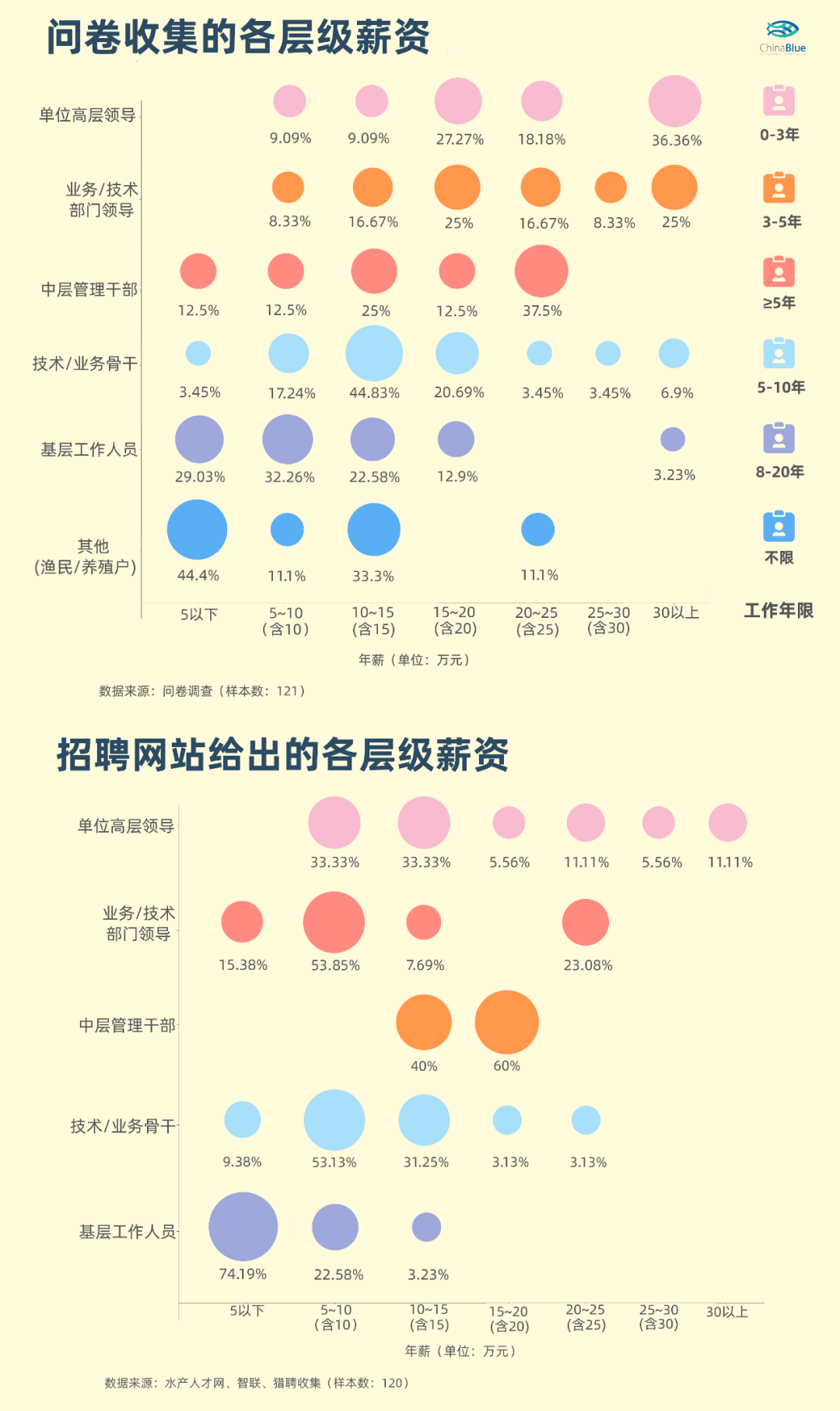 根据各大招聘网站发布的招聘信息和我们的调查问卷可以看到,在渔业(水产)行业中,基层工作人员的从业年限基本在两年以内,年收入普遍在5万元以下,部分业绩突出的销售人员或从业年限在10年以上的养殖户,年收入能达到15万元;从业年限3-5年能达到技术/业务骨干或中层管理干部的级别,年收入在10-15万元之间,分化比较大;而5-15万的年收入为渔业(水产)行业内的普遍收入水平(在各职位层级中出现的频次最多)。
