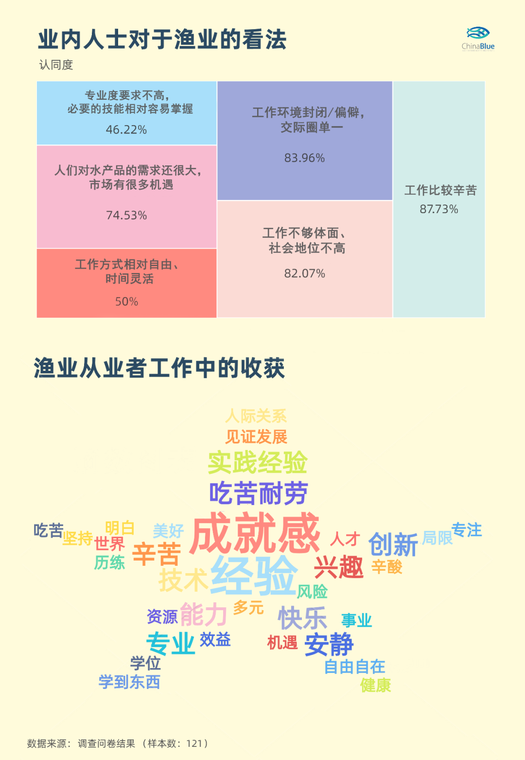 我们结合渔业(水产)行业的收入、工作内容、发展前景、社会地位等,收集信息并面向大学以上学历的渔业(水产)行业内的从业者,专门做了《中国渔业从业者专业背景和工作状况调查》的网络调查问卷(回收121份有效问卷),并进一步对渔业(水产)行业现状做了分析。