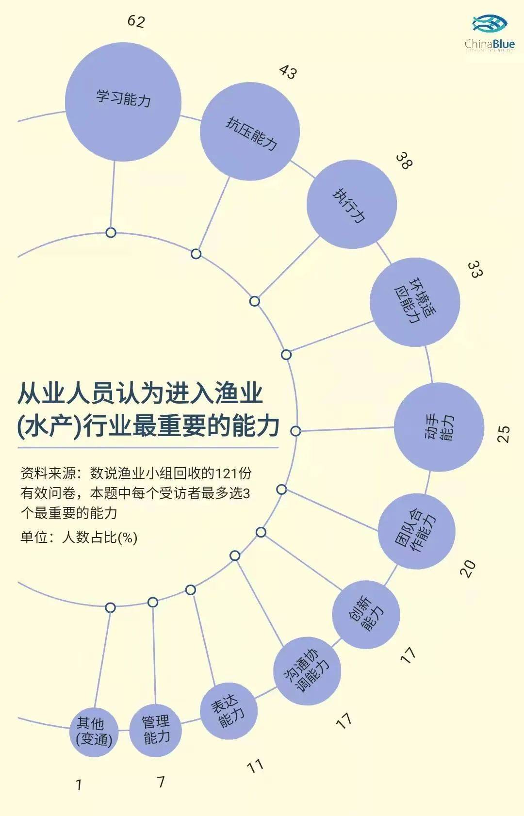 根据我们的调查问卷显示:62%的受访者表示,在进入渔业(水产)行业中,最重要的能力之一是学习能力;其次是抗压能力(43%的受访者这么认为)和执行力(38%的受访者这么认为) 。