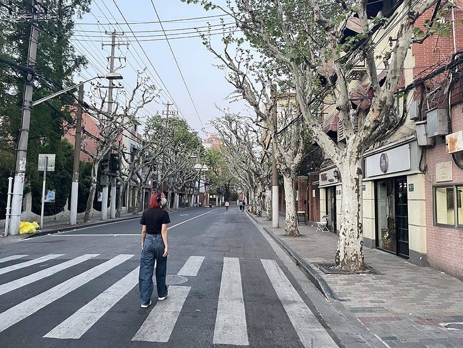 上海愚园路街道的防范区,空旷的马路,大部分居民继续在家“屏牢”。澎湃新闻记者 唐屹 图