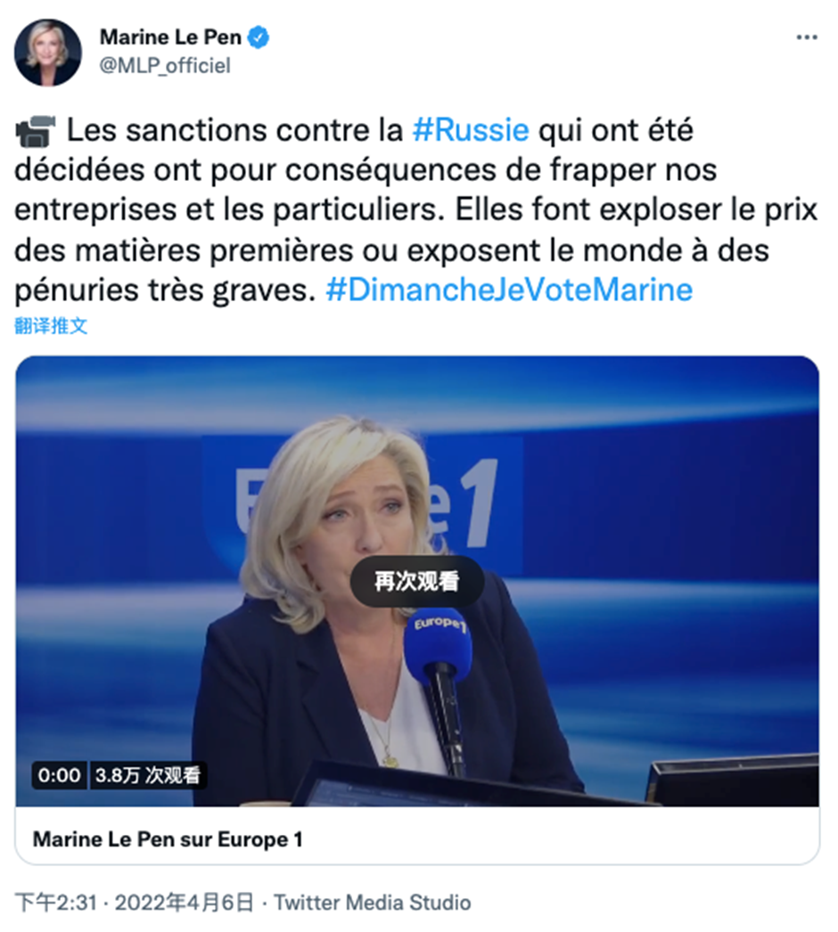 这只是她大量此类言论的一个缩影,她很巧妙地用制裁造成的经济后果来大做文章,指责马克龙应对通胀不力,牵引民众们对购买力下降的恐慌,这非常有效——尤其联想到给马克龙政权造成极大困扰的“黄背心”运动爆发的直接原因就是燃油税政策对农村地区民生的影响。