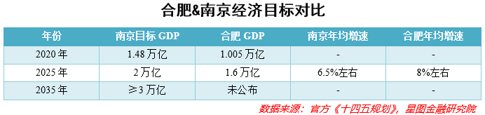 另外,根据南京公布的2035年远景计划,“南京经济总量和居民人均收入将比2020年增长一倍以上”,意味着2035年南京GDP至少要达到3万亿元,不过合肥并没有公布2035年的GDP目标数值。