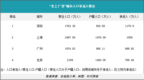 深圳之外,上海的人口净流入也超过了1000万人,达至1009万人;排名第三的是广州,其净流入人口为888.92万人;而北京的人口净流入则位居第四,为788.2万人。