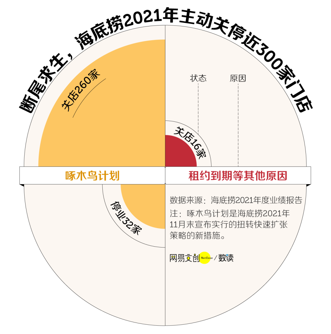 根据最新年报,2021 年海底捞关停了 308 家门店,除了 16 家是租约到期的原因,其余 292 家都属于被“啄木鸟计划”选中的“差生”,其中 260 家将永久闭店,还有 32 家暂时停业休整,择机重开。