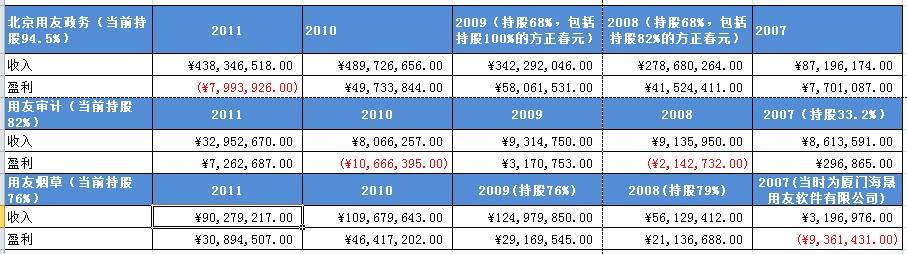用友烟草的利润倒是相对稳定,利润率也很高,不过规模非常有限,虽说前几天爆出的烟草的高利润引起了轩然大波,但信息化厂商显然没尝到更多的甜头,有说法是用友只搞定了国家烟草专卖局,而旗下各个烟厂,其实很多还是用的SAP之类的。如此一来,对未来其市场空间感觉比较悲观,这一块业务只是锦上添花而已。