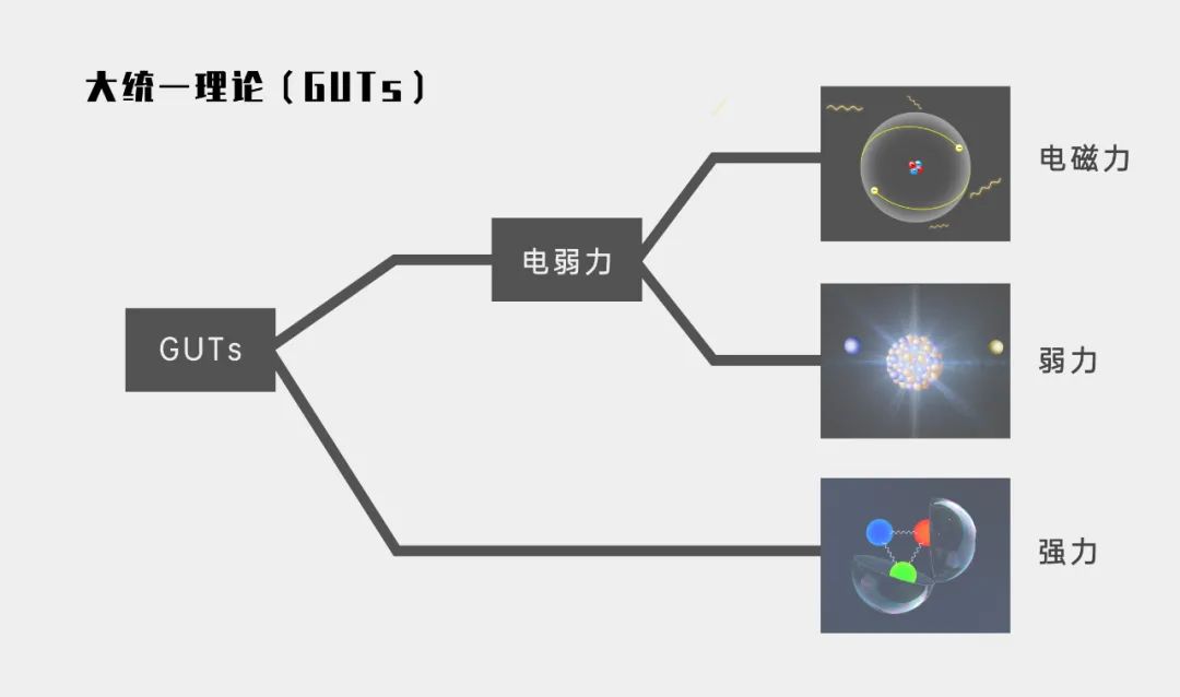 上个世纪七十年代,物理学家已经运用量子物理学来解释已知四种基本力中的三种——电磁力、弱力和强力。许多物理学家相信,在温度极高的早期宇宙中,这三种基本力会在非常高的能量(约10¹⁶GeV)下合并成一个“大统一”力。就像物理学家已经确认,电磁力和弱力在高能下可以统一成电弱力一样。然而,直接检验大统一理论超出了当前粒子加速器的能力范围。但大统一理论却做出了一个惊人的预言,那就是质子可以衰变成更轻的粒子(比如正电子和π介子)。这就意味着宇宙中所有的物质,都将在有限的未来衰变。