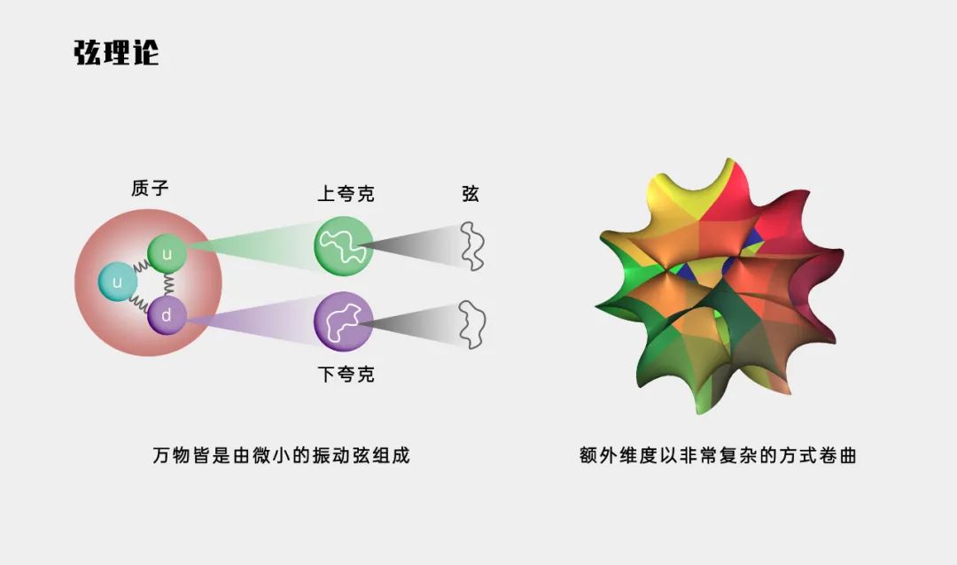 弦理论的基本思想是,已知的基本粒子实际上是由弦构成的。这些弦必须在10个维度(9个空间维度加1个时间维度)中移动和振动。10个维度实际上是弦理论的一个预测,如果我们试图在更高或更低的维度中构建方程,那么它们在数学上就会变得不一致。所以,既然我们显然生活在一个只有三维空间的宇宙中,那么额外的维度必须以某种方式在非常小的尺度上被卷起来(或者说“紧致化”),以至于我们无法注意到它们。