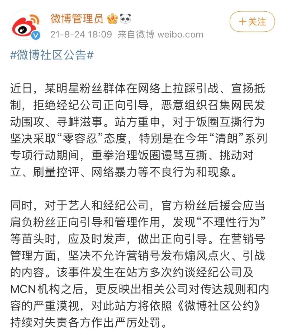 @微博管理员从2021年5月21号开始,相继发布“微博粉圈健康生态专项行动系列公告”,截至目前超过3000个饭圈微博账号受到禁言30天或永久关停不同程度的惩罚,上万条微博互撕微博被清理,超2000个互撕谩骂超话被关闭。