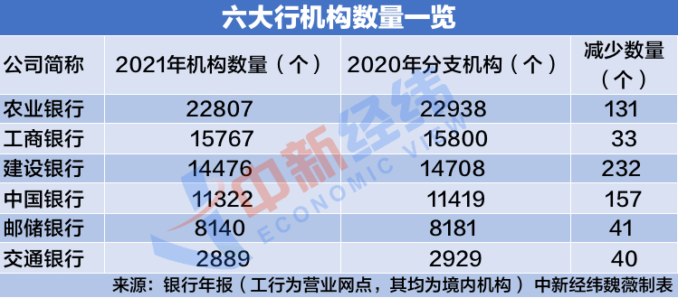 银行网点减少了吗?中新经纬梳理六大国有行2021年年报数据发现,截至2021年末,六大行境内分支机构数量较上年末共计减少634个。
