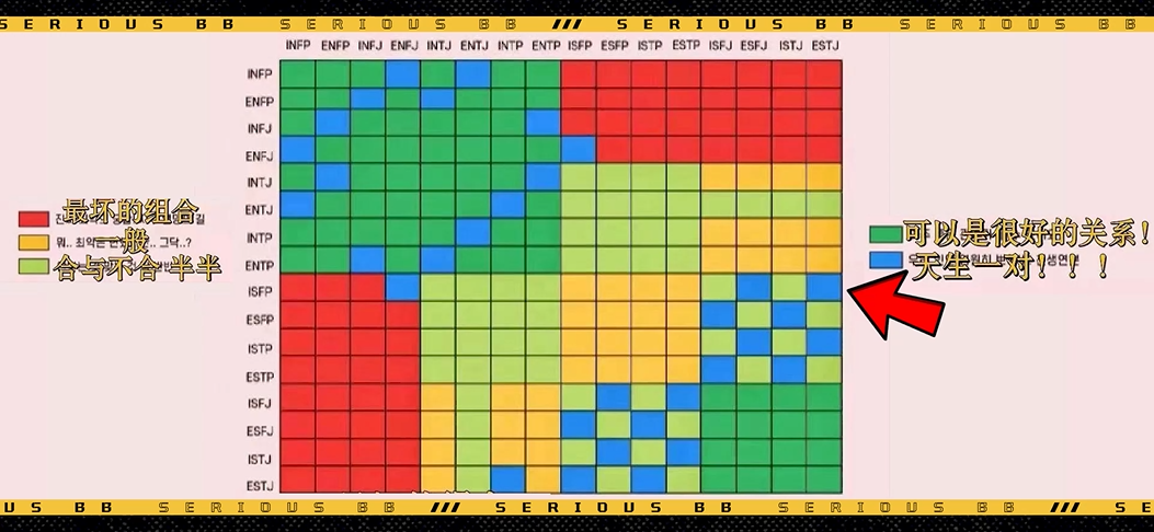 从剧情来看,夏冬春的人格很有可能是ESTJ,结合这张匹配图,不难发现,她和ISFP人格的宜修十分登对,这与剧情也是吻合的。