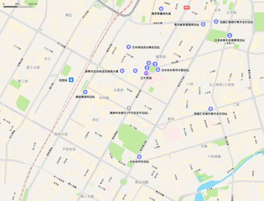 这些日本西式建筑中,值得一提的是沈阳火车站(日本占领时期称为奉天驿),它的出现和它与外部的关联应该算是东北日本建筑的缩影。