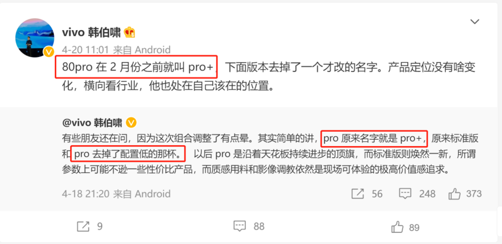 最明显就是 vivo 刚发布的 X80 系列。X80 系列发布之前,vivo 产品经理韩伯啸就在微博上点明,X80 Pro 原本的就叫做 Pro+,且他们也取消了原来的低配,也就是“中杯”。