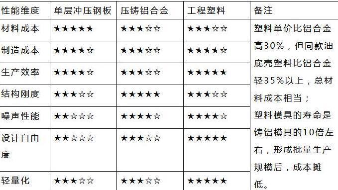 在油底壳材质的选择上,各家汽车公司的做法不同,也无规律可循。按照《萝卜报告》的统计,进口奔驰S级和迈巴赫使用塑料油底壳,奔驰E级使用金属油底壳;奥迪纵置平台车型使用塑料油底壳,横置平台车型使用金属油底壳;保时捷全系塑料油底壳。