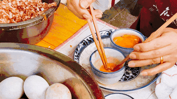 肉沉子是游埠古镇的头牌,别看名字古怪,其实就是往生鸡蛋黄里填肉沫,但真要做起来可是个“精细活”:选取当地土猪肉中的夹心肉,肥瘦相掺,辅以土酱油、料酒等作料,剁碎搅匀便是那肉沉子的馅料。再在碗中敲入一个鸡蛋,用筷子慢慢把馅料塞入生蛋黄里,锅中倒水大火烧开,放入“肉沉子”温火煮上五六分钟,捞出放入碗中,加葱花和酱油,“肉沉子”便大功告成。