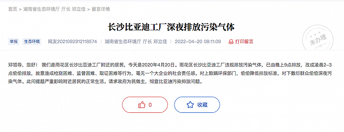 业主们通过各种渠道为自己发声,在问政湖南的官网上,也有不少关于比亚迪排放废气的留言举报。“比亚迪工厂污染疑致多名儿童流鼻血”的话题一度登上热搜。