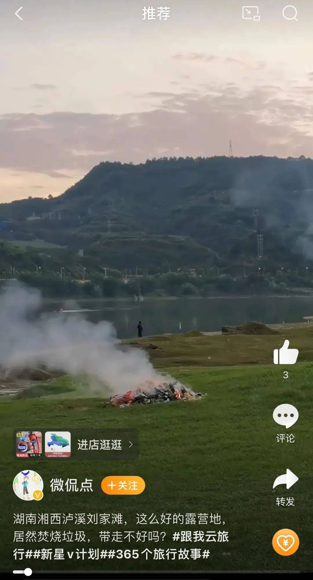 无独有偶,“五一”过后的湖南湘西泸溪刘家滩也很忙——忙着烧垃圾。在网友发布的视频里,只见一堆堆垃圾在风景如画的刘家滩焚烧,留下了秃噜皮的草地。