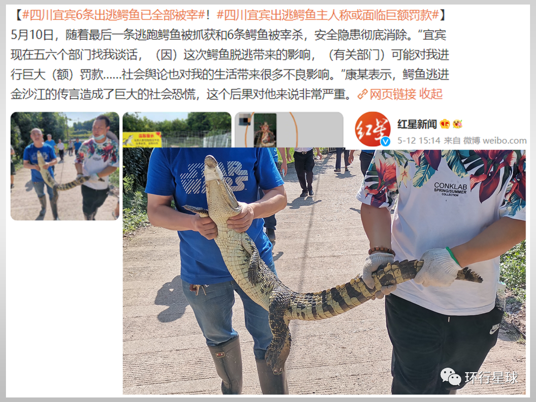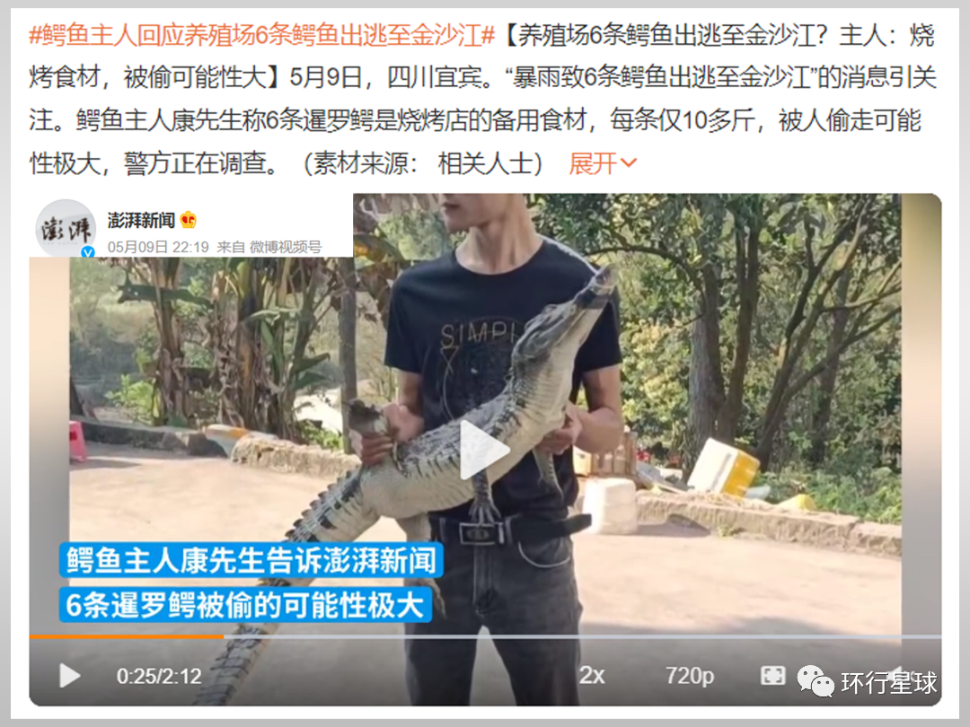 5月9日,一条“鳄鱼出逃至金沙江”消息在四川宜宾流传开来。随后,当地公安机关通报确有村民报警称养殖池的6条鳄鱼不知去向。而令吃瓜群众们没想到的是,第二天下午,出逃的宜宾“鳄鱼6兄弟”就全部“归案”,金沙江安全隐患彻底解除,游泳爱好者们又可以继续放心去浪了。