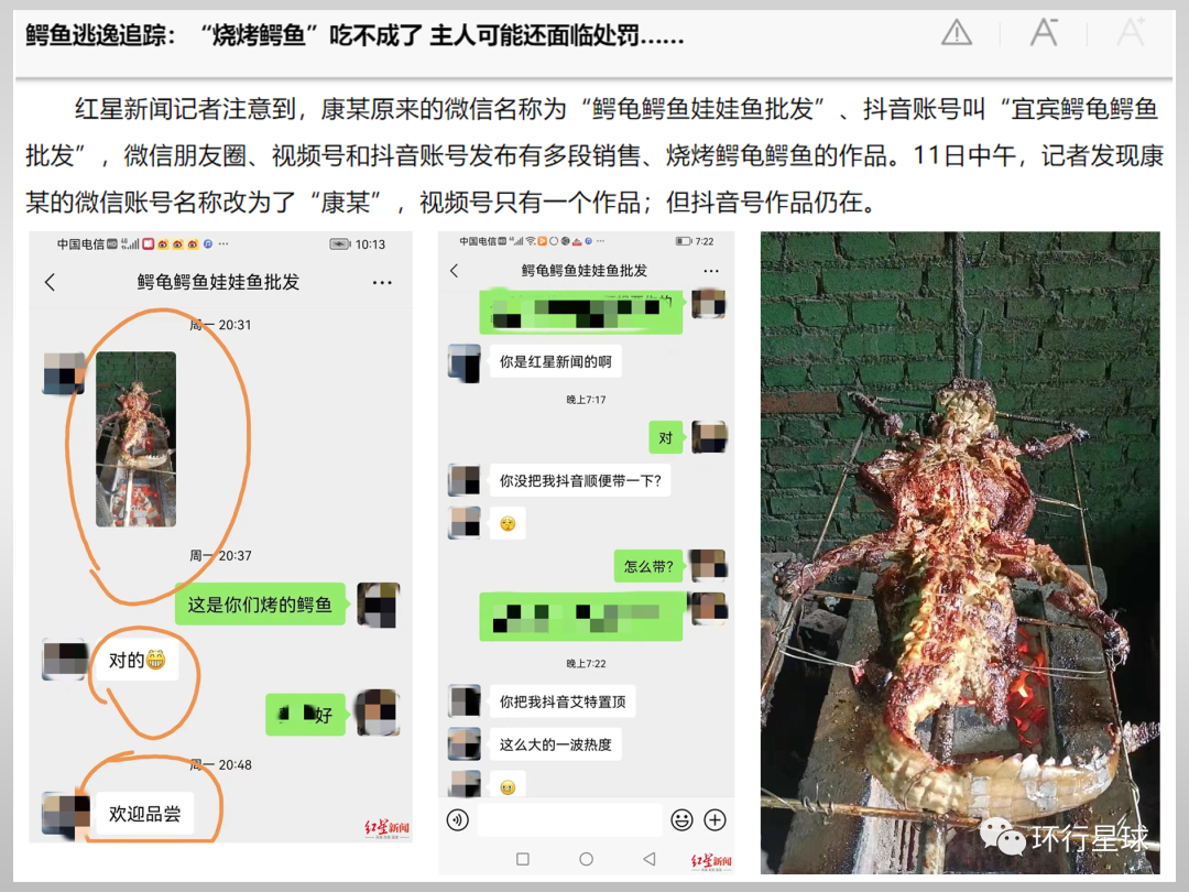 当事人康某微信名称叫“鳄龟鳄鱼娃娃鱼批发”,发布的朋友圈动态多与烧烤鳄鱼有关。但事发后,康某称自己没有饲养鳄鱼,也没有资质,其是从有资质的养殖场买鳄鱼进行中转销售,或卖到餐饮店做食材,鳄鱼池只是临时中转。