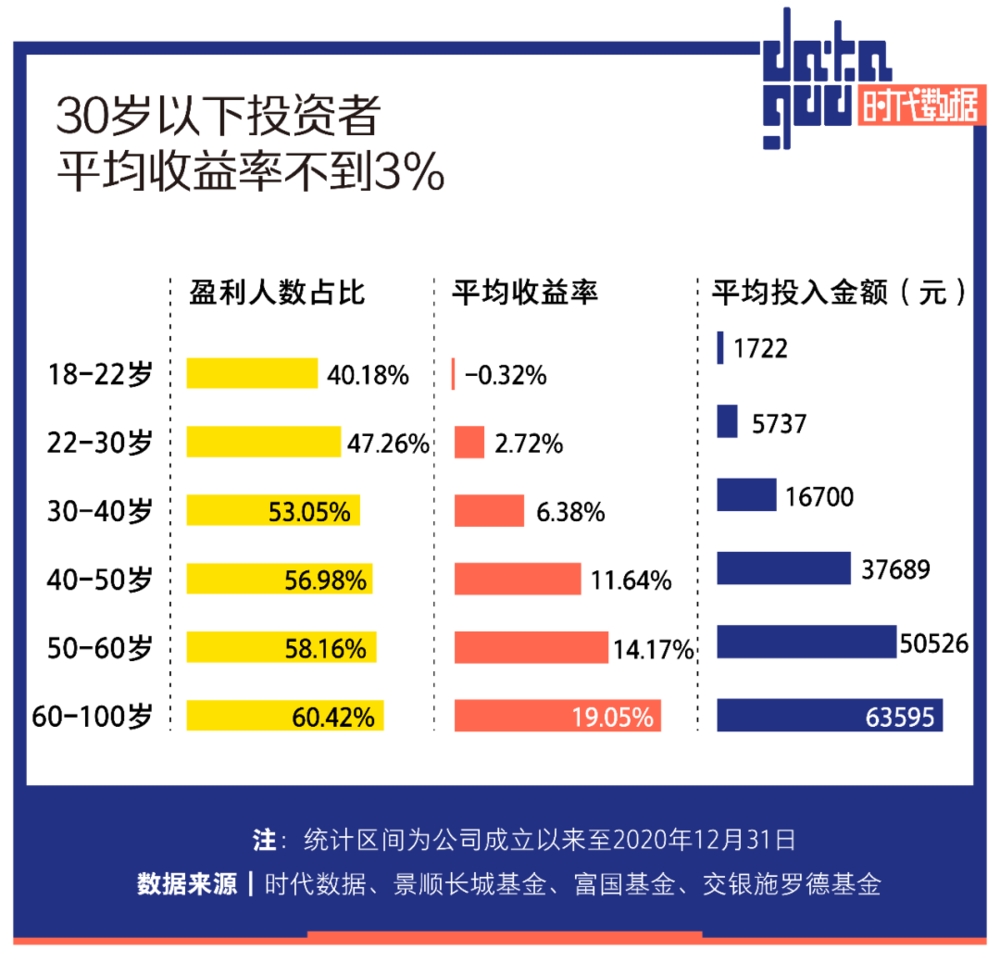 上述报告数据显示,2021年一季度末,30岁以下投资者平均收益率不到3%,盈利人数占比不到50%。