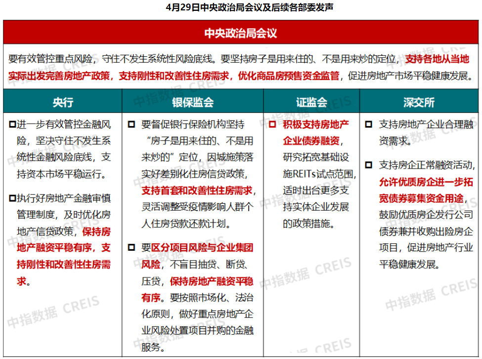 4月29日,一个重磅消息迅速传开:新华社当天发布消息,中共中央政治局召开会议,分析研究当前经济形势和经济工作。会议明确表态,“支持各地从当地实际出发完善房地产政策,支持刚性和改善性住房需求,优化商品房预售资金监管,促进房地产市场平稳健康发展。”