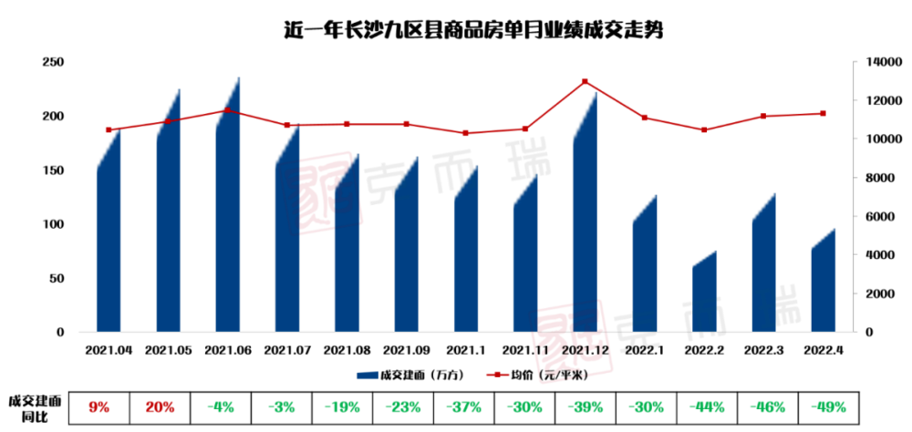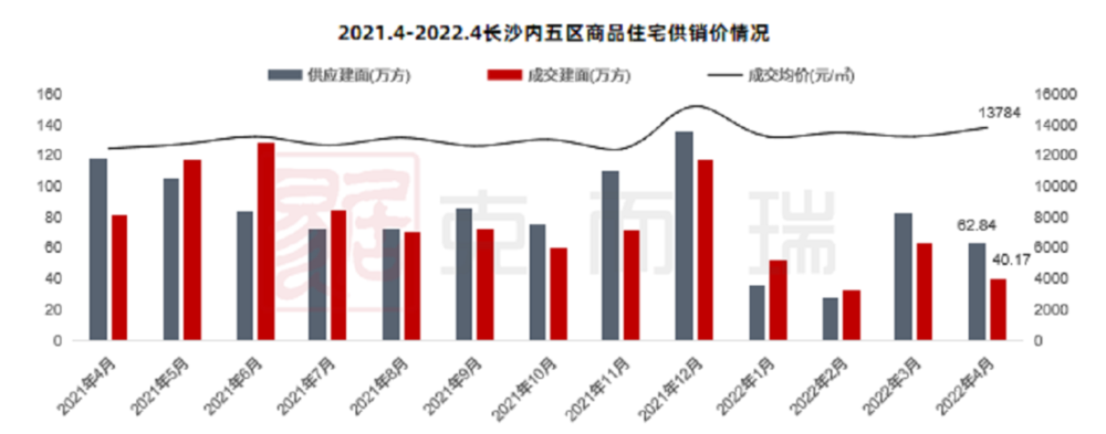 克而瑞数据显示,长沙九区县商品房自2021年6月成交量同比开始下跌,且跌幅不断加大,在2021年三四季度达到30%以上跌幅,至2022年一季度同比下滑超过40%,购房者观望情绪较浓。今年4月成交量同比下滑达到49%,成交收缩明显。[3]